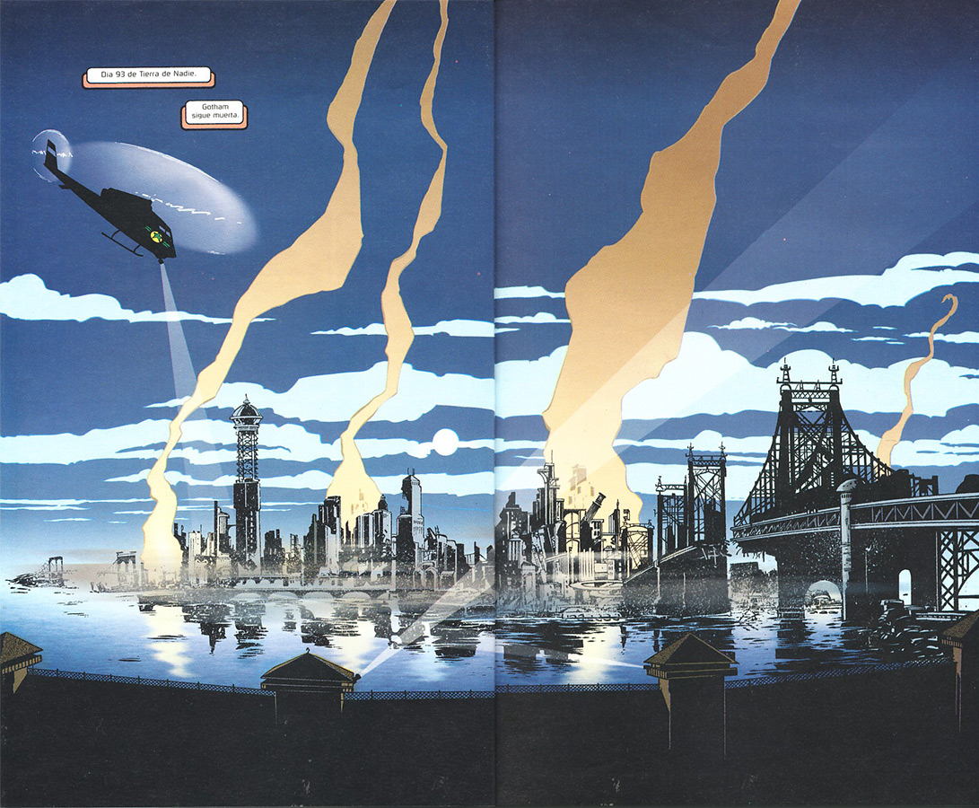 «…Y después de que la tierra temblara y los edificios se derrumbaran, la nación abandonó a Ciudad Gótica. Y sólo los valientes, los ambiciosos y los locos permanecieron en un lugar llamado Tierra de Nadie.»